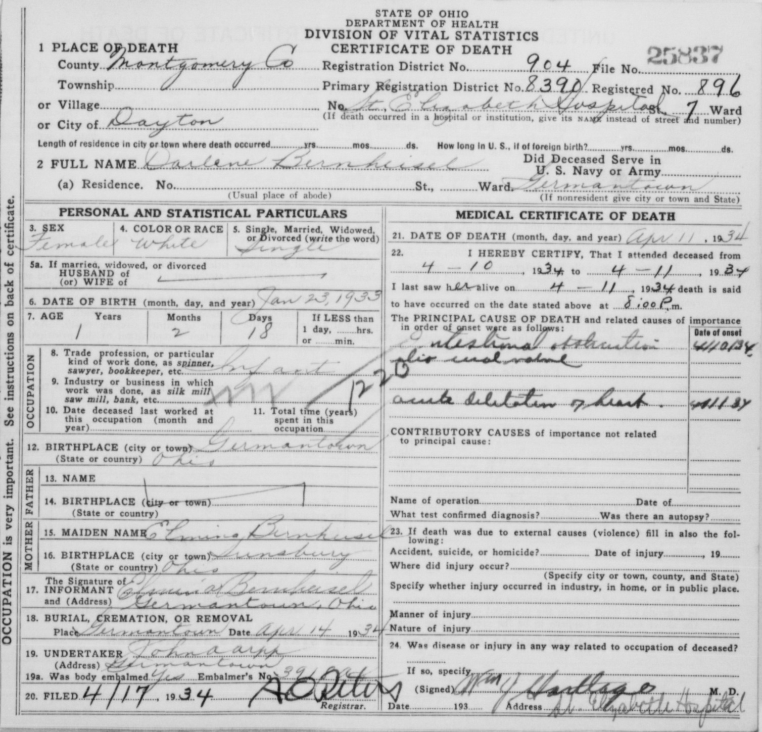Darlene Bernheisel [scrapbook] 1 was born on 23 Jan 1933 in Germantown, Montgomery Co, OH. She died on 11 Apr 1934 in St Elizabeth Hospital, Dayton, Montgomery Co, OH. She was buried on 14 Apr 1934 in Germantown Cemetery, Germantown, Montgomery Co, OH.
