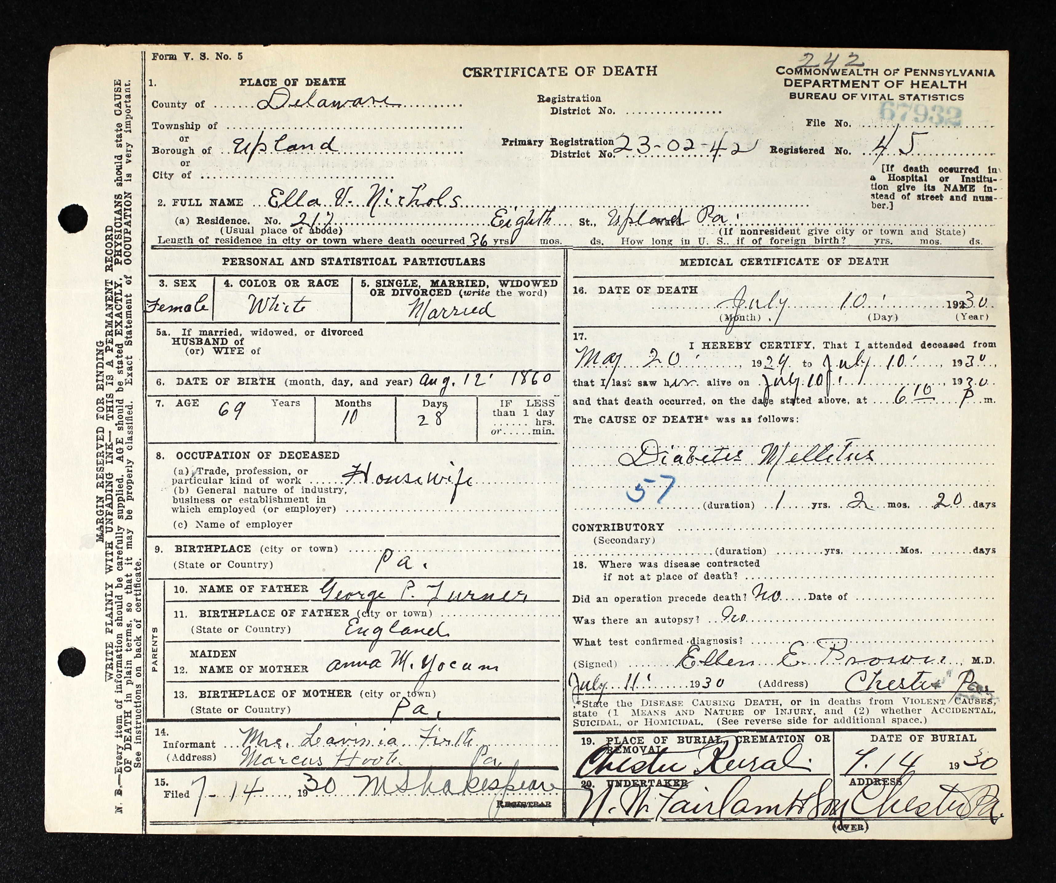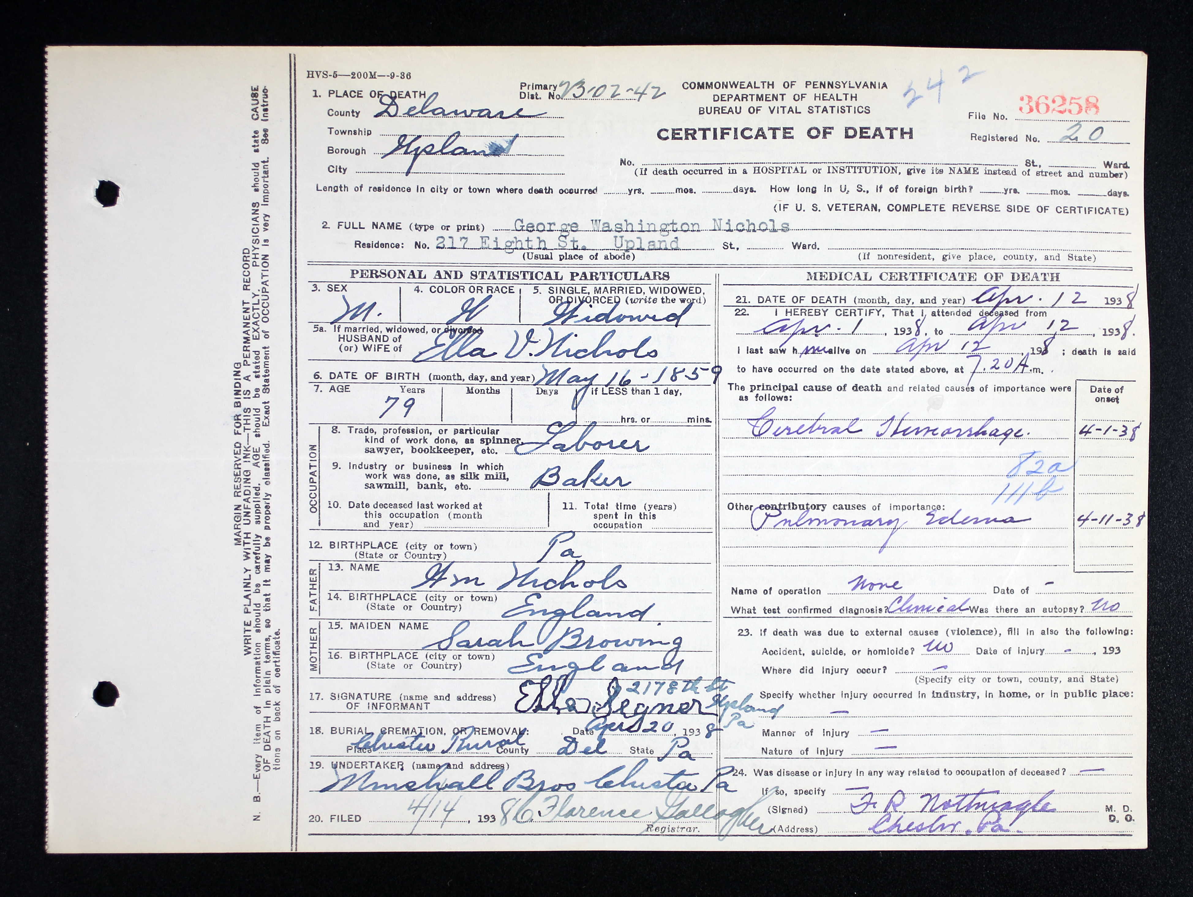Ella married George Washington Nichols [scrapbook] 1, son of William Nichols and Sarah A Browning, about 1883. George was born on 16 May 1858/1859 in PA. He died on 12 Apr 1938 in Upland, Delaware Co, PA. He was buried on 20 Apr 1938 in Chester Rural Cemetery, Chester, Delaware Co, PA. |