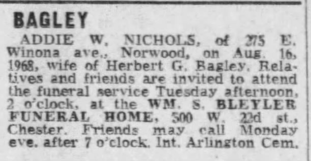 Addie married Herbert G Bagley 1, son of John Bagley Sr and Katherine "Kate", about 1925. Herbert was born about 1901 in PA. He died on 3 Mar 1989. He was buried in Sunnyside Sec, Arlington Cemetery, Drexel Hill, Delaware Co, PA.