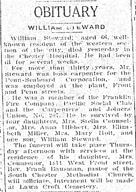 Elizabeth married William Stewart [scrapbook] 1, son of [Male] Stewart and [Female], in 1878. William was born on 28 Aug 1859 in Delaware Co, PA. He was baptized in Chester, Delaware Co, PA. He died on 24 Dec 1923 in Chester Hospital, Chester, Delaware Co, PA. He was buried on 27 Dec 1923 in Lawncroft Cemetery, Linwood, Delaware Co, PA. |