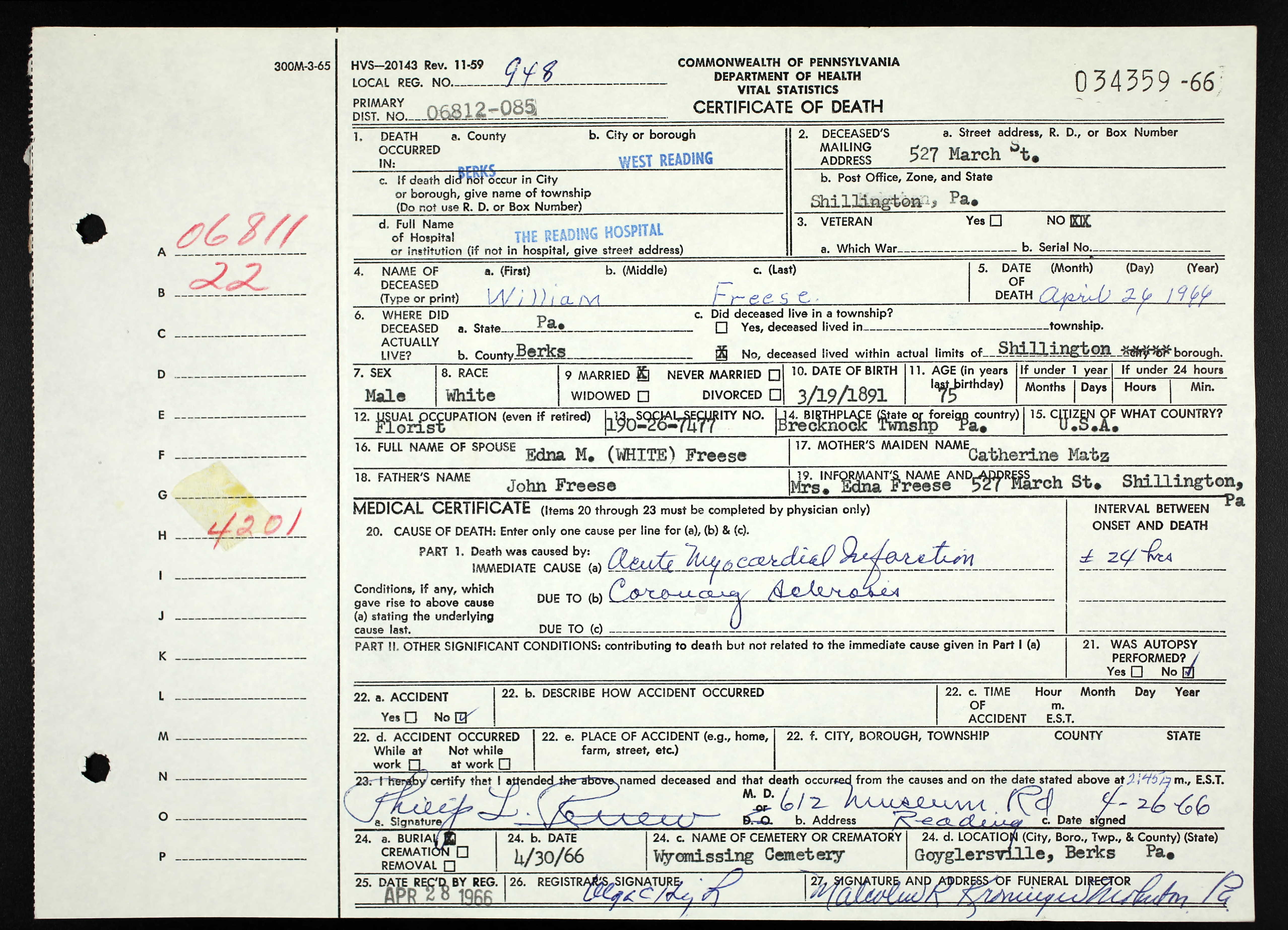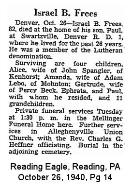 William Freese [scrapbook] 1, 2, 3 was born on 19 Mar 1891 in Brecknock Twp, Berks Co, PA. He died on 26 Apr 1966 in Reading Hospital, West Reading, Berks Co, PA. He was buried on 30 Apr 1966 in Wyomissing Cemetery, Gouglersville, Berks Co, PA.