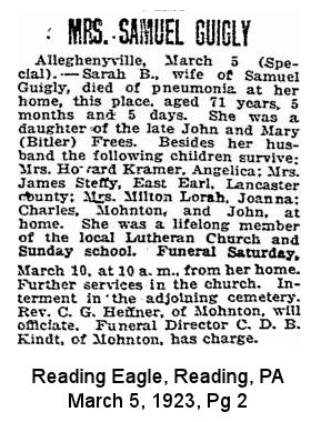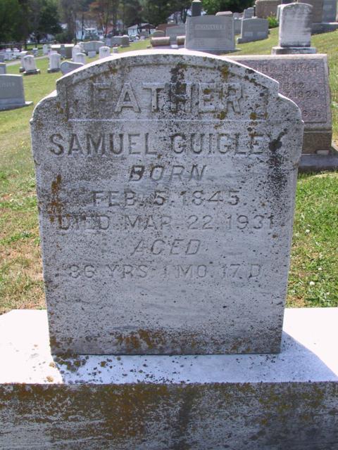 Sarah also married Samuel W Guigley [scrapbook] 1, 2, 3, 4, 5, 6, 7, 8, son of Samuel Guigley and Sophia Wise, about 1883. Samuel was born on 5 Feb 1845 in Brecknock Twp, Berks Co, PA. He died on 22 Mar 1931 in Brecknock Twp, Berks Co, PA. He was buried on 26 Mar 1931 in Allegheny Union Cemetery (new), Alleghenyville, Berks Co, PA. |