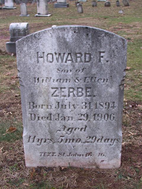 Howard F. Zerbe [scrapbook] 1, 2, 3, 4, 5 was born 6, 7, 8, 9, 10 on 31 Jul 1894 in Lancaster Co, PA. He died 11, 12, 13, 14, 15 on 29 Jan 1906 in Brecknock Twp, Lancaster Co, PA. He was buried 16, 17 on 2 Feb 1906 in Allegheny Church Cemetery (old), Alleghenyville, Berks Co, PA.