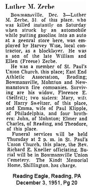 Luther Milton Zerbe [scrapbook] 1, 2, 3, 4, 5, 6, 7, 8, 9 was born 10, 11, 12, 13 on 5 Jul 1899 in Bowmansville, Lancaster Co, PA. He died 14 on 1 Dec 1951 in Brecknock Twp, Lancaster Co, PA. He was buried on 4 Dec 1951 in Bowmansville Union Cemetery, Bowmansville, Lancaster Co, PA.