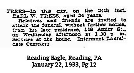 Earl W Frees [scrapbook] 1, 2, 3 was born in Jul 1899 in Bowmansville, Lancaster Co, PA. He died on 21 Jan 1933 in Reading, Berks Co, PA. He was buried on 25 Jan 1933 in Laureldale Cemetery, Tuckerton, Muhlenberg Twp, Berks Co, PA.