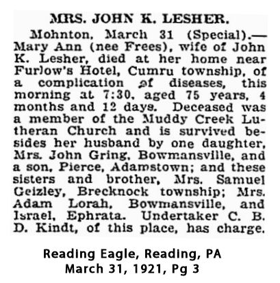 John resided in 1880 in East Cocalico Twp, Lancaster Co, PA.+ 2544 M iii Pierce F Lesher was born on 12 Sep 1882. He died on 13 Oct 1962.