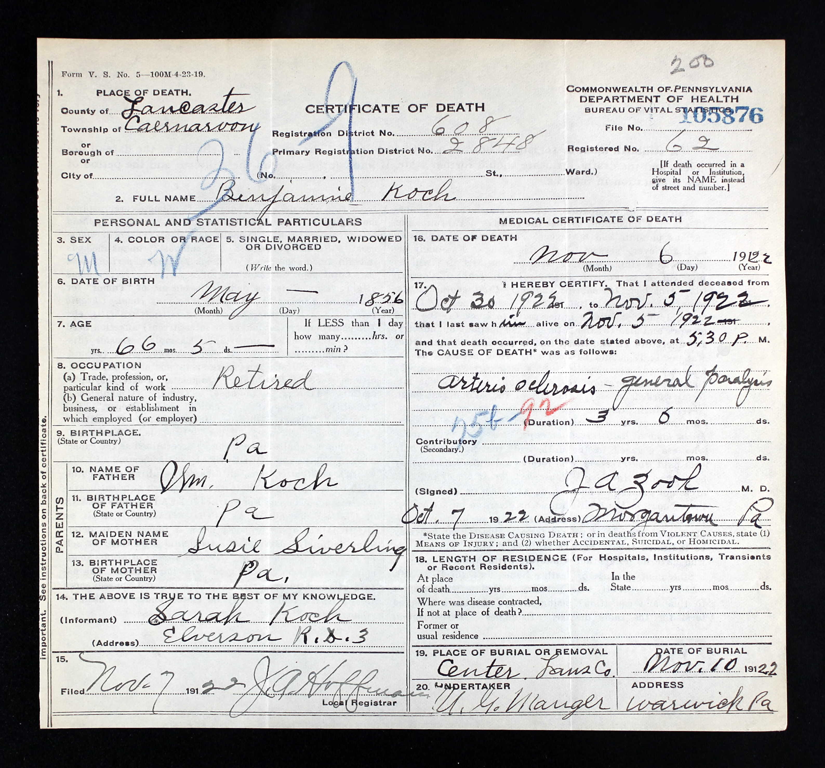 Emma married Benjamin Koch [scrapbook], son of William Koch and Susanna Siverling "Susie", on 27 Nov 1877 in Reading, Berks Co, PA. The marriage ended in divorce. Benjamin was born on 2 May 1858 in Lancaster Co, PA. He was baptized on 21 May 1859 in St. John's Evangelical Lutheran Church, East Earl Twp, Lancaster Co, PA. He died on 6 Nov 1922 in Caernarvon Twp, Lancaster Co, PA. He was buried in St. John's Evangelical Lutheran Church Cemetery, East Earl Twp, Lancaster Co, PA. |