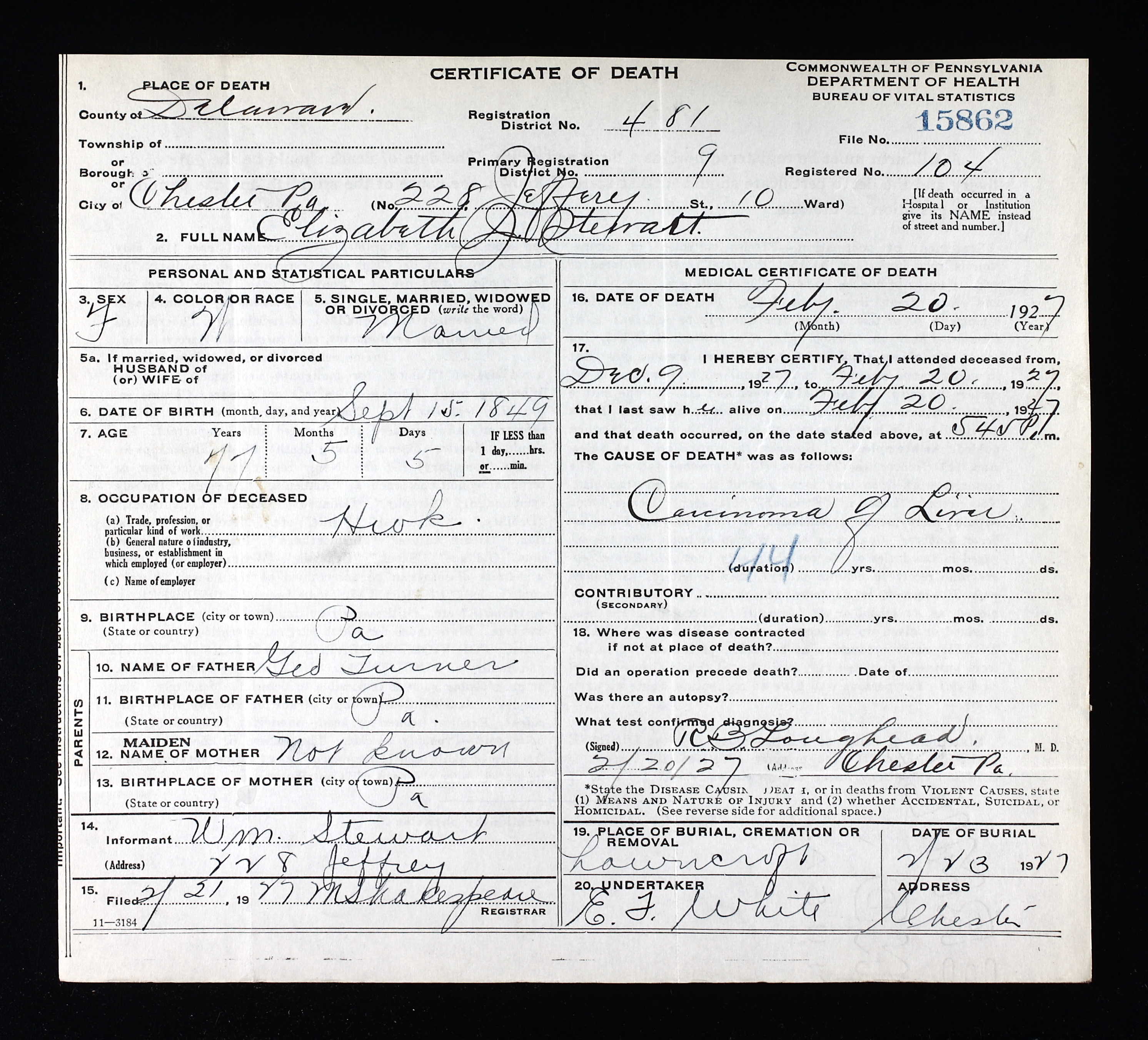 ) was born on 15 Sep 1850 in Chester Co, PA. She died on 20 Feb 1927 in Chester, Delaware Co, PA. She was buried on 23 Feb 1927 in C-241 Gr 4, Lawncroft Cemetery, Linwood, Delaware Co, PA. |