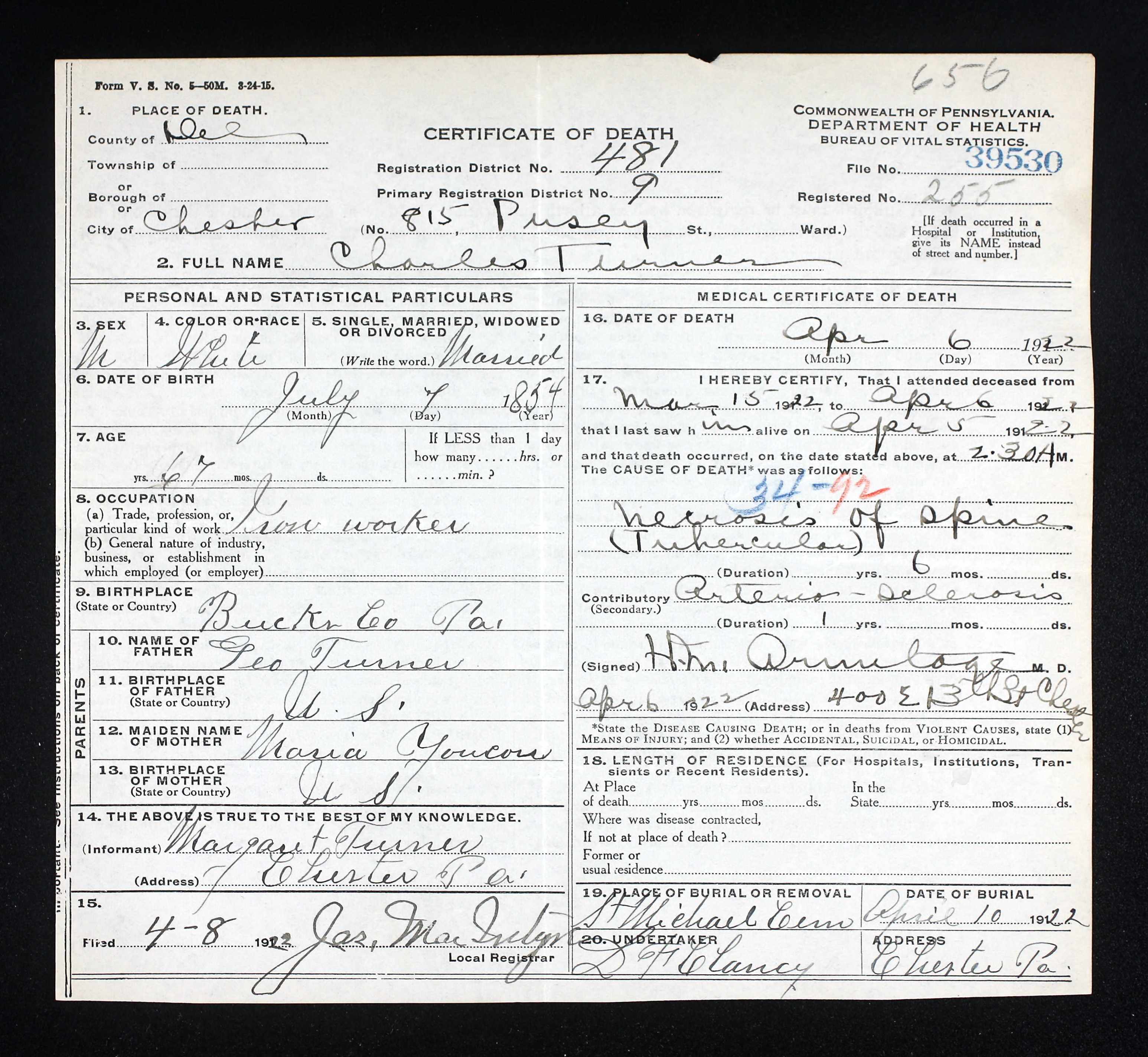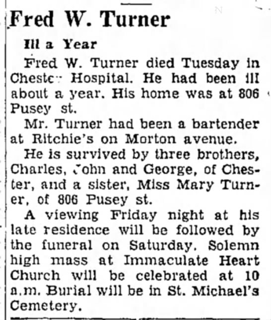 Frederick William "Fred" Turner [scrapbook] 1, 2, 3 was born on 29 Oct 1892 in Chester, Delaware Co, PA. He died on 13 May 1952 in Chester Hospital, Chester, Delaware Co, PA. He was buried on 17 May 1952 in St Michaels Cemetery, Chester, Delaware Co, PA.