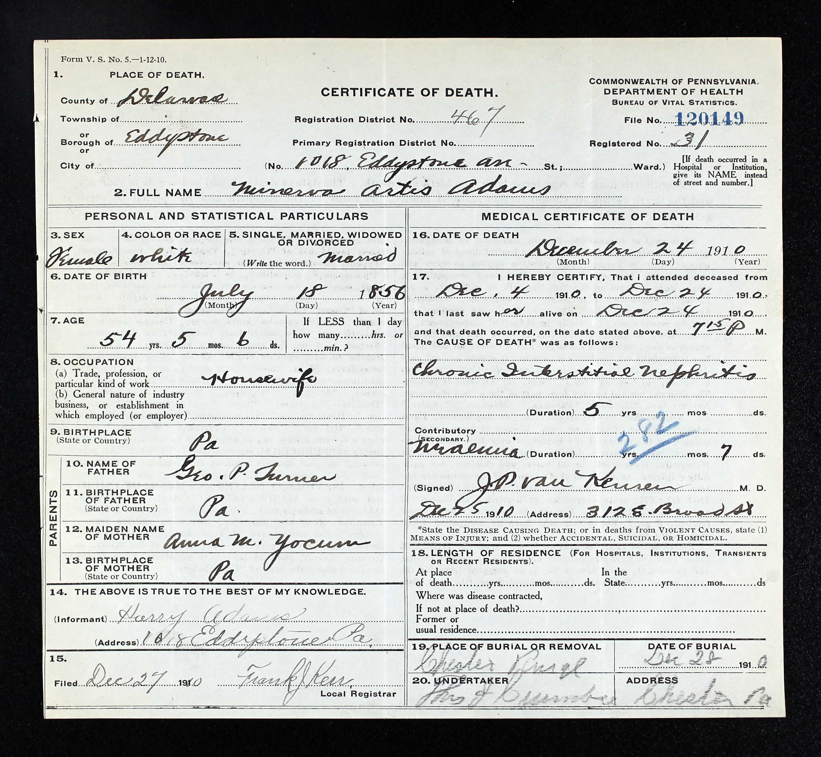 Addie resided in 1900 in Eighth St, Upland, Delaware Co, PA. She resided in 1910 in Eighth St, Upland, Delaware Co, PA. She resided in 1920 in Eighth St, Upland, Delaware Co, PA. She worked as clerk - office railroad company in 1920. She resided in 1930 in 217 Eighth St, Upland, Delaware Co, PA. She resided in Aug 1968 in 275 E Winona Ave, Norwood, Delaware Co, PA.