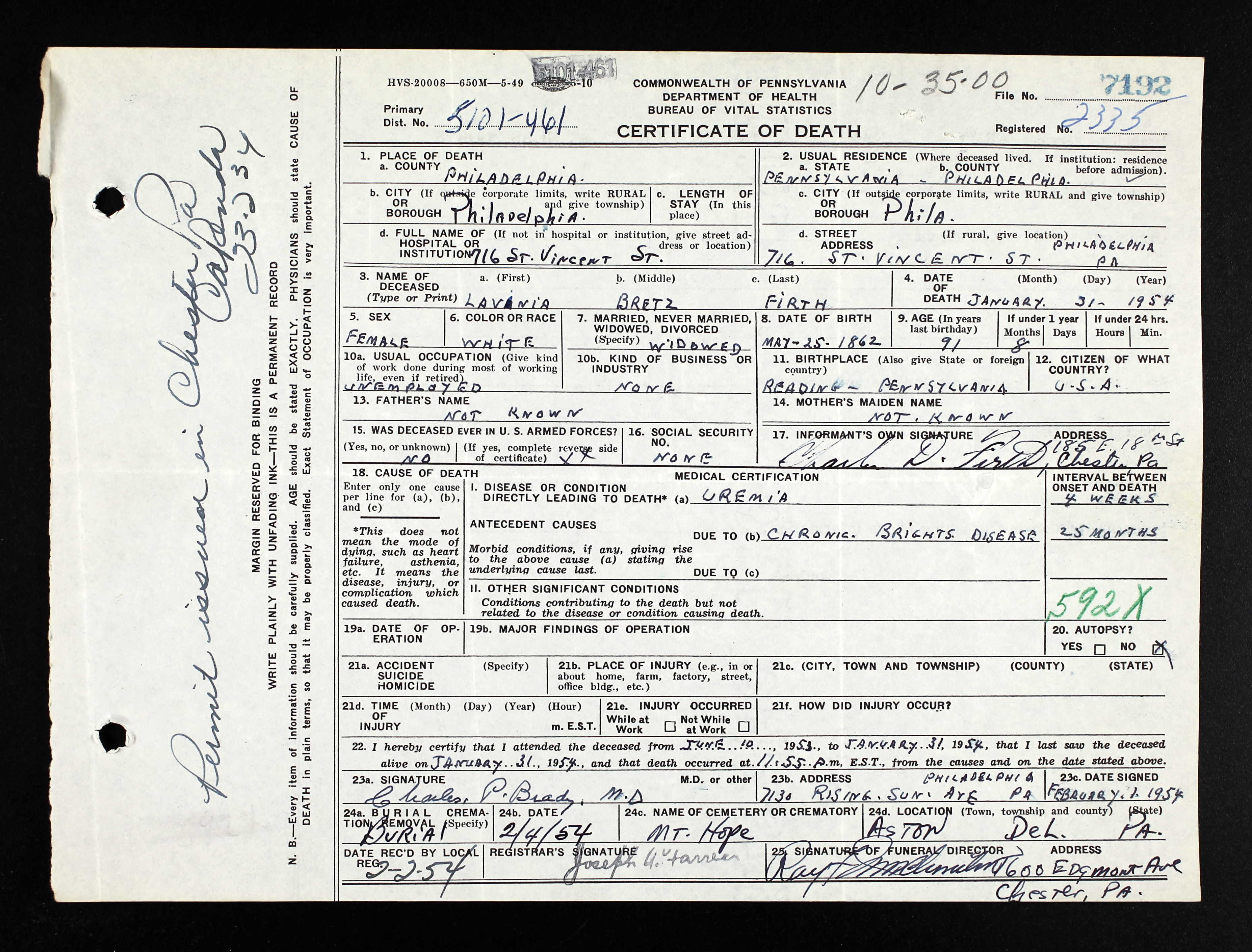 ) was born on 25 May 1862 in Reading, Berks Co, PA. She died 3 on 1 Feb 1954 in Philadelphia, Philadelphia Co, PA. She was buried on 4 Feb 1954 in Mount Hope Cemetery, Aston, Delaware Co, PA. |