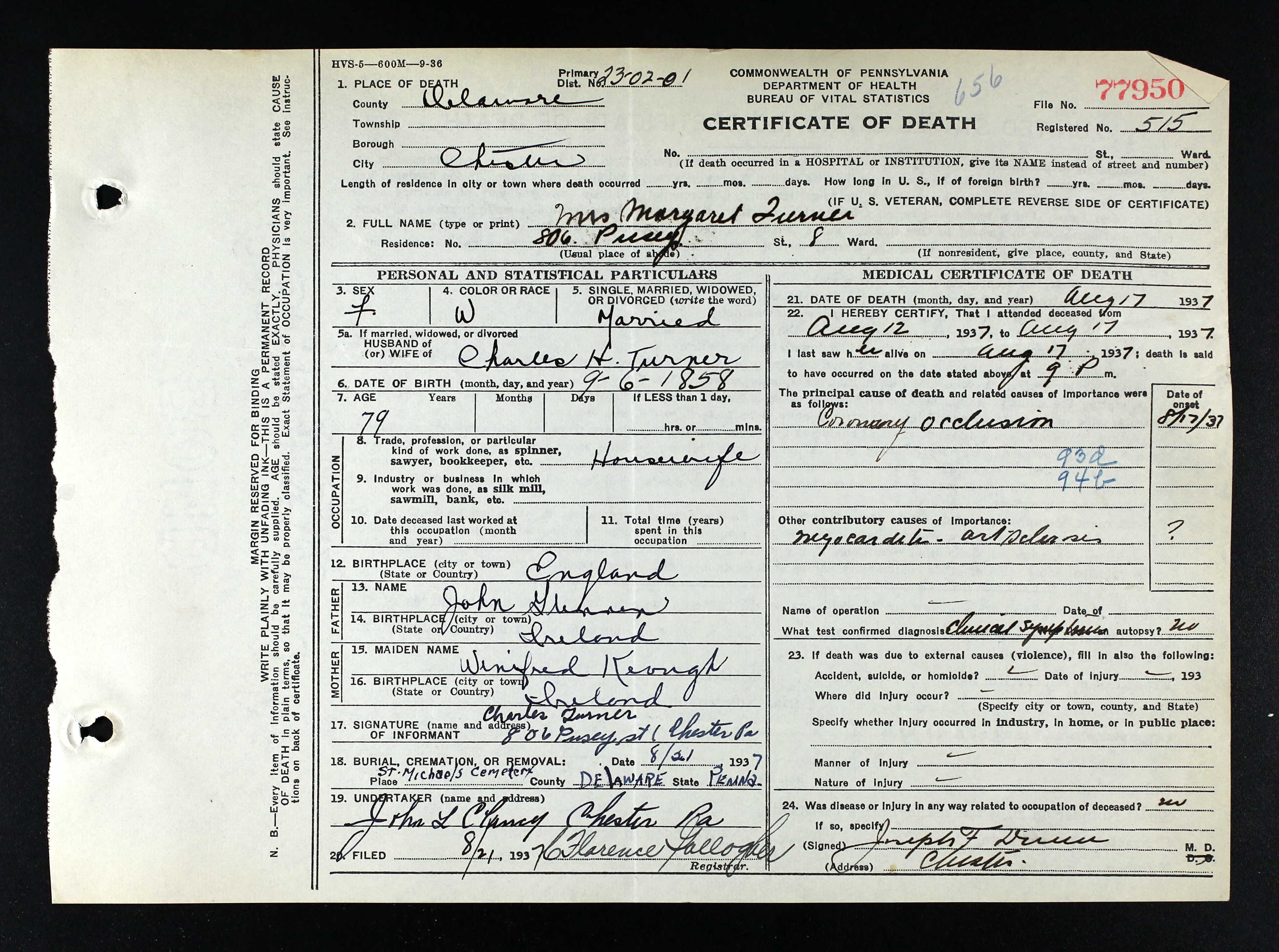 Mary resided in 1900 in 815 Pusey St, Chester, Delaware Co, PA. She resided in 1910 in 815 Pusey St, Chester, Delaware Co, PA. She worked with Delaware County Register of Wills in Media, PA. She resided in 1920 in 815 Pusey St, Chester, Delaware Co, PA. She worked as Winder - Silk Mill in 1920. She resided in 1942 in 806 Pusey St, Chester, Delaware Co, PA. She resided in Oct 1956 in 806 Pusey St, Chester, Delaware Co, PA.+ 2582 M ii Frank Pierce Turner was born on 19 Apr 1885. He died on 14 Mar 1951. + 2583 M iii Charles Henry Turner Jr was born on 15 Feb 1888. + 2584 M iv John Thomas Turner was born on 10 Feb 1890. 2585 M v