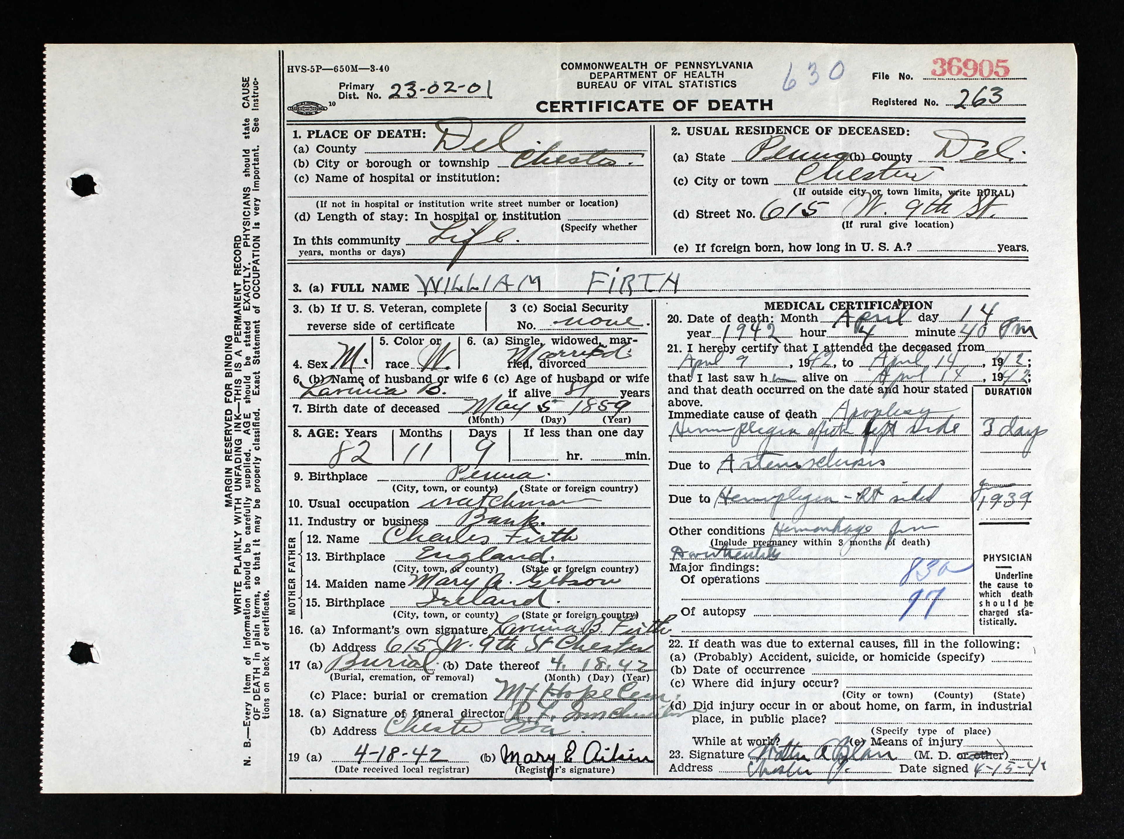 Lavina married 1 William Charles Firth [scrapbook] 2, 3, son of Charles Firth and Mary A Gbson, on 4 Jul 1880 in Upland Methodist Episcopal Church, Upland, Chester Co, PA. William was born on 5 May 1859 in PA. He died on 14 Apr 1942 in Chester, Delaware Co, PA. He was buried on 18 Apr 1942 in Mount Hope Cemetery, Aston, Delaware Co, PA. They were married by Rev. Nathaniel Turner. |