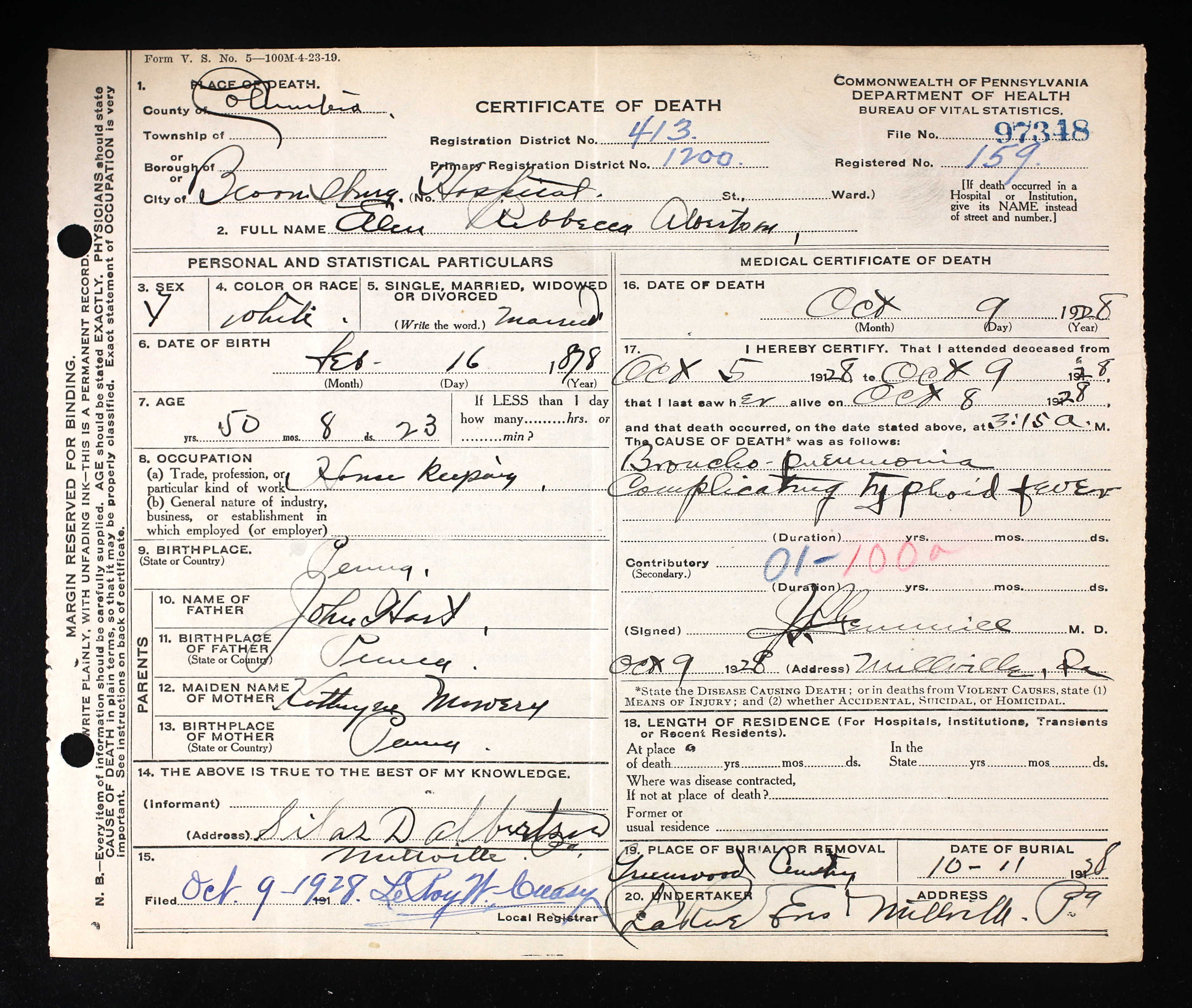 ) was born on 16 Feb 1869 in PA. She died on 9 Oct 1928 in Bloomsburg Hospital, Bloomsburg, Columbia Co, PA. She was buried on 11 Oct 1928 in Lemon Cemetery, Greenwood Twp, Columbia Co, PA. |