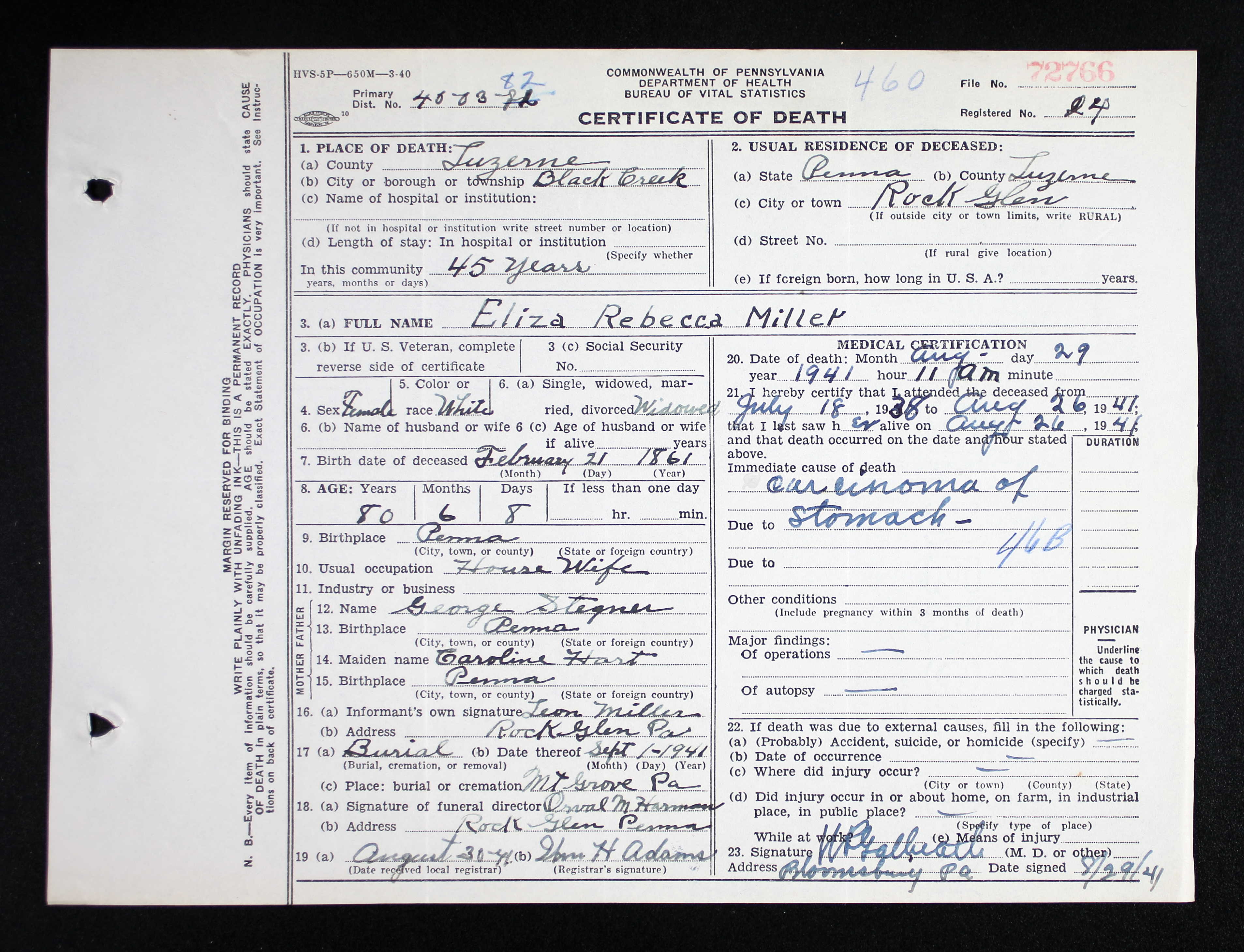 Carrie resided in 1910 in Beaver Twp, Columbia Co, PA. She resided in 1920 in Mountain Grove Rd, Black Creek Twp, Luzerne Co, PA.