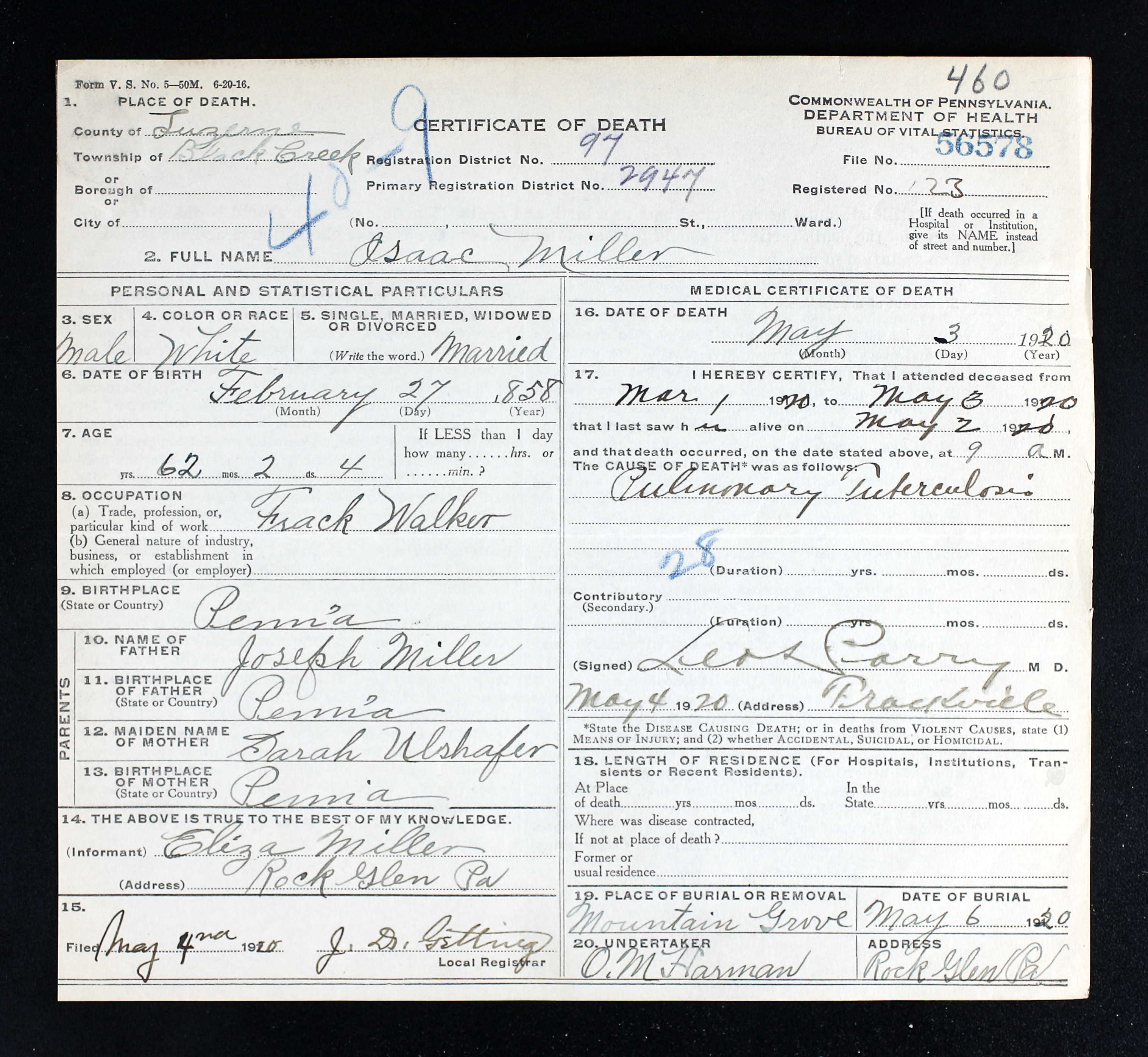 Eliza married Isaac W Miller [scrapbook] 1, son of Joseph Miller and Sarah Ulshafer. Isaac was born on 27 Feb 1858 in PA. He died on 3 May 1920 in Black Creek Twp, Luzerne Co, PA. He was buried on 6 May 1920 in Mountain Grove Cemetery, Mountain Grove, Luzerne Co, PA. |