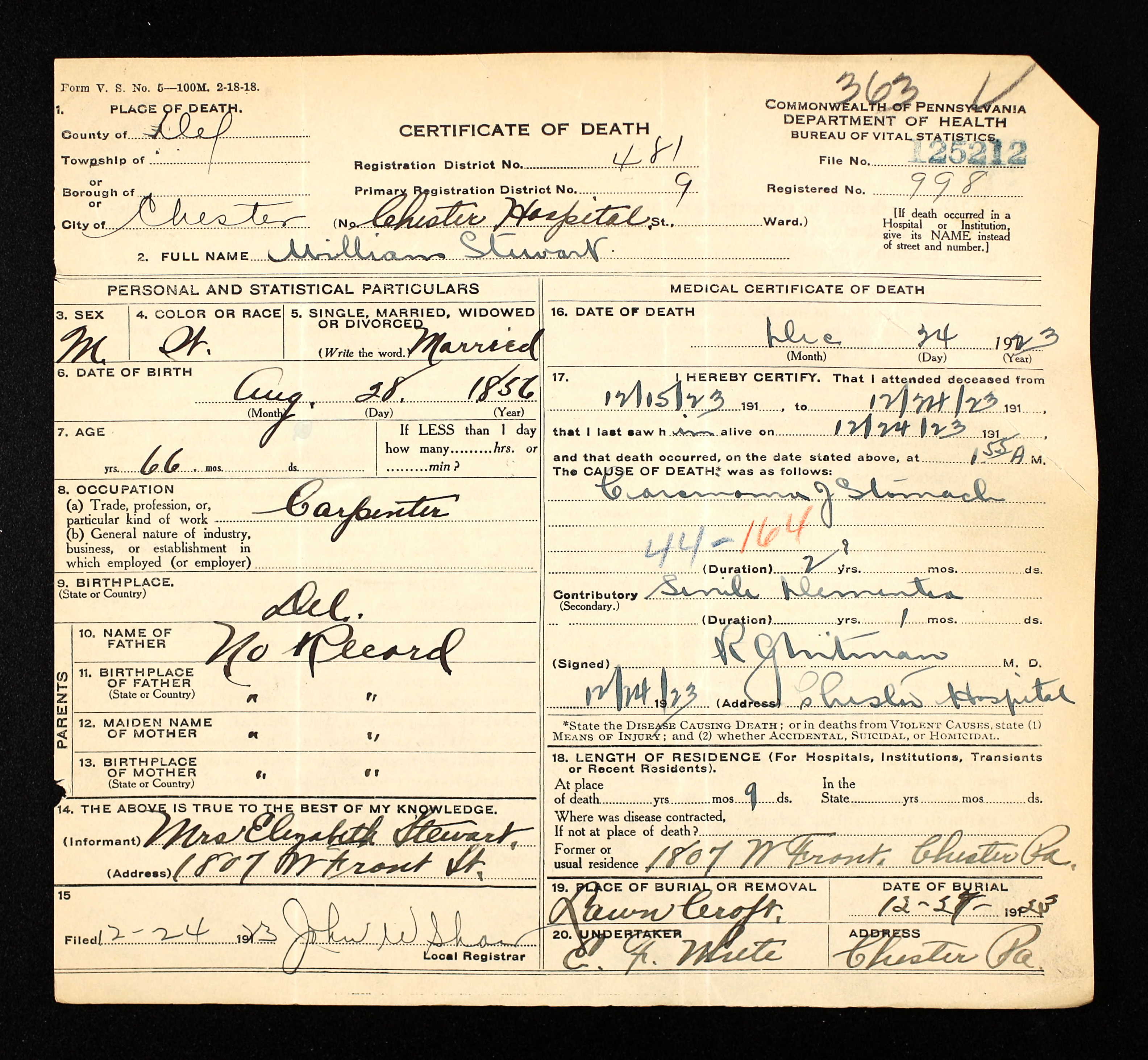 | William Stewart - PA Death Certificate - 1923 |