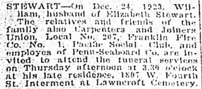 | William Stewart - Death Notice - 1923 Delaware County Daily Times, Chester, PA, December 26, 1923, Pg 12 |