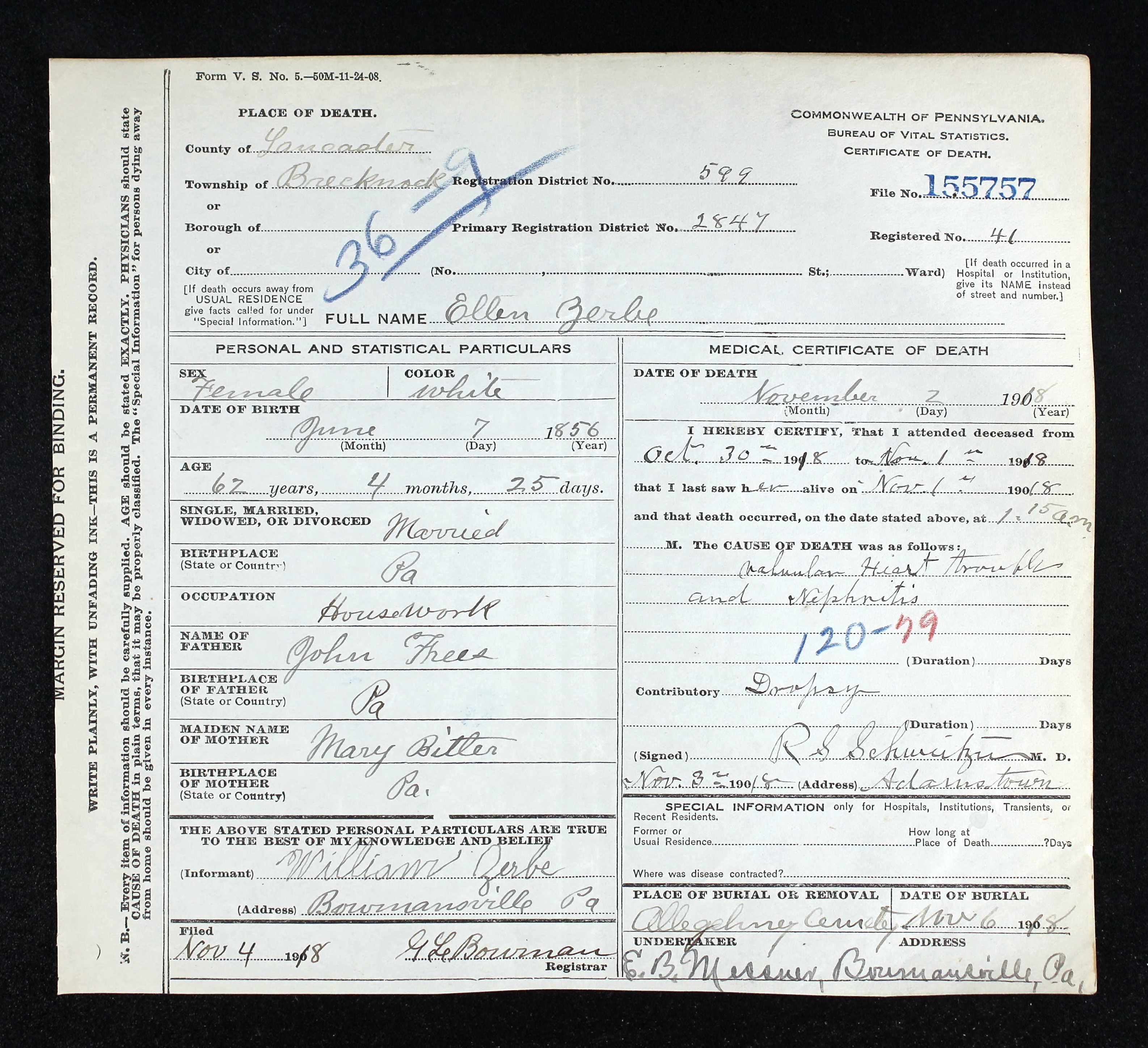 | Ellen (Frees) Zerbe - PA Death Certificate |