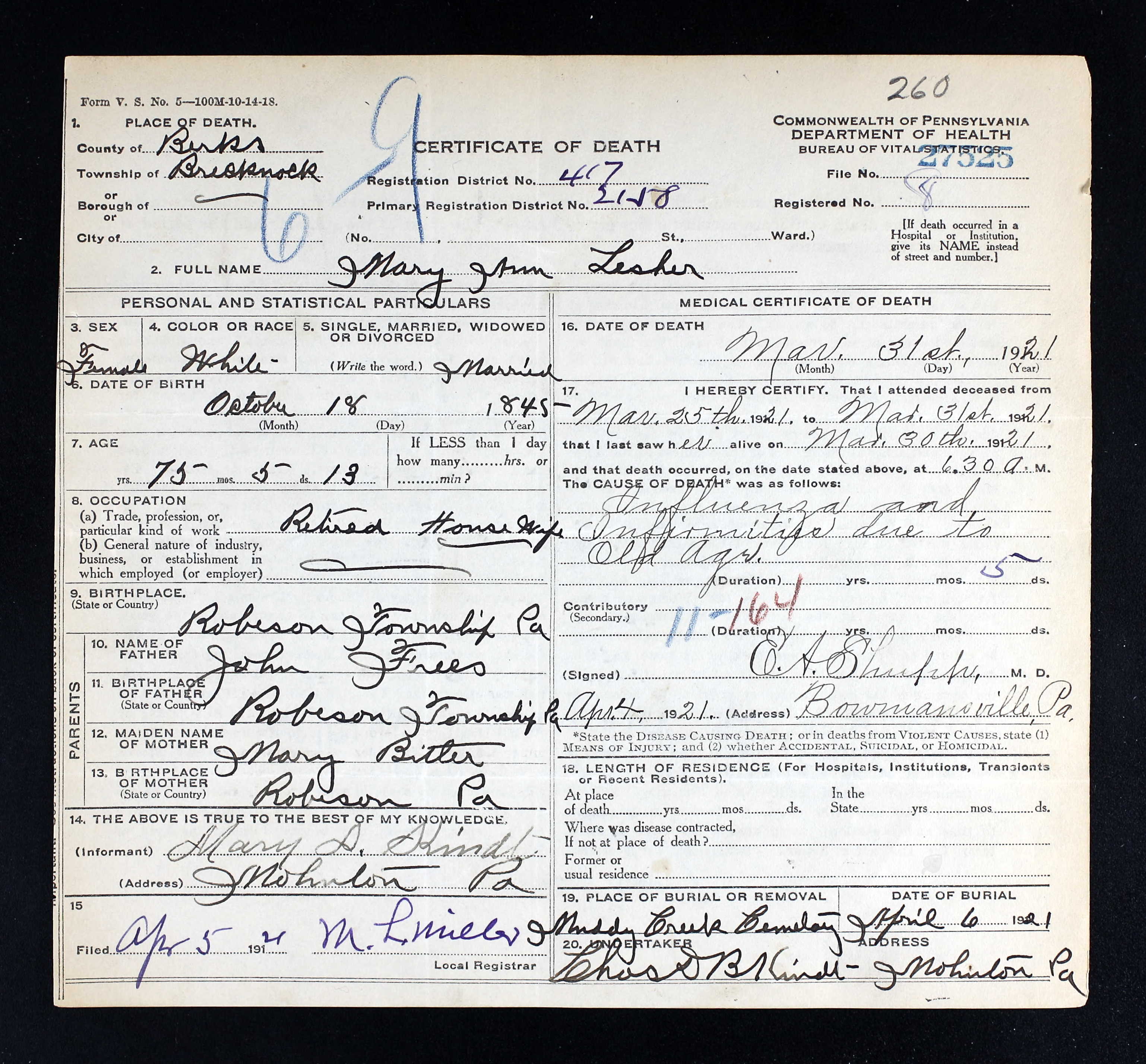 | Mary Ann (Frees) Lesher - PA Death Certificate |