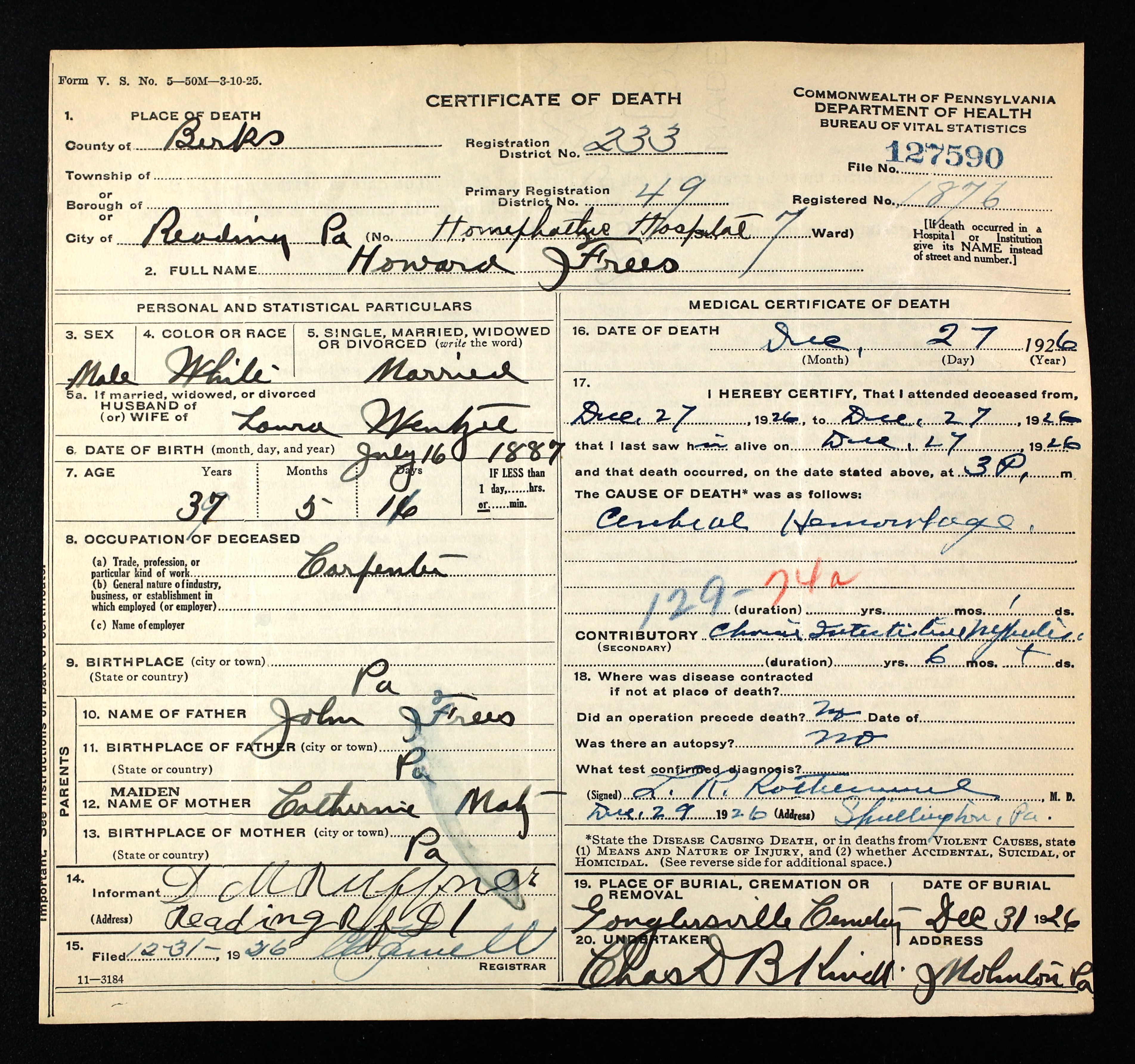 | Howard Frees - PA Death Certificate - 1926 |