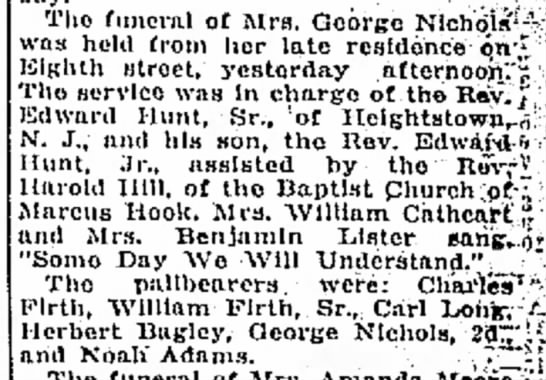 | Mrs. George (Ella VanLeer) Nichols Funeral - 1930 Delaware County Daily Times, Chester, PA, July 15, 1930, Pg 15 |