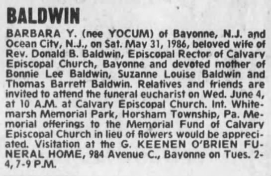 | Barbara Ann (Yocum) Baldwin Obituary - 1986 The Philadelphia Inquirer, Philadelphia, PA, June 3, 1986, Pg 38 |
